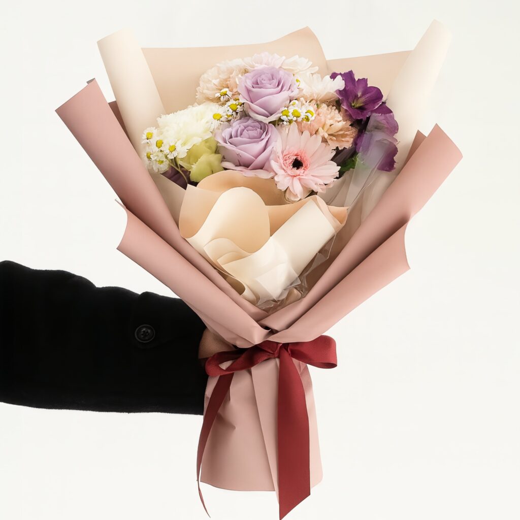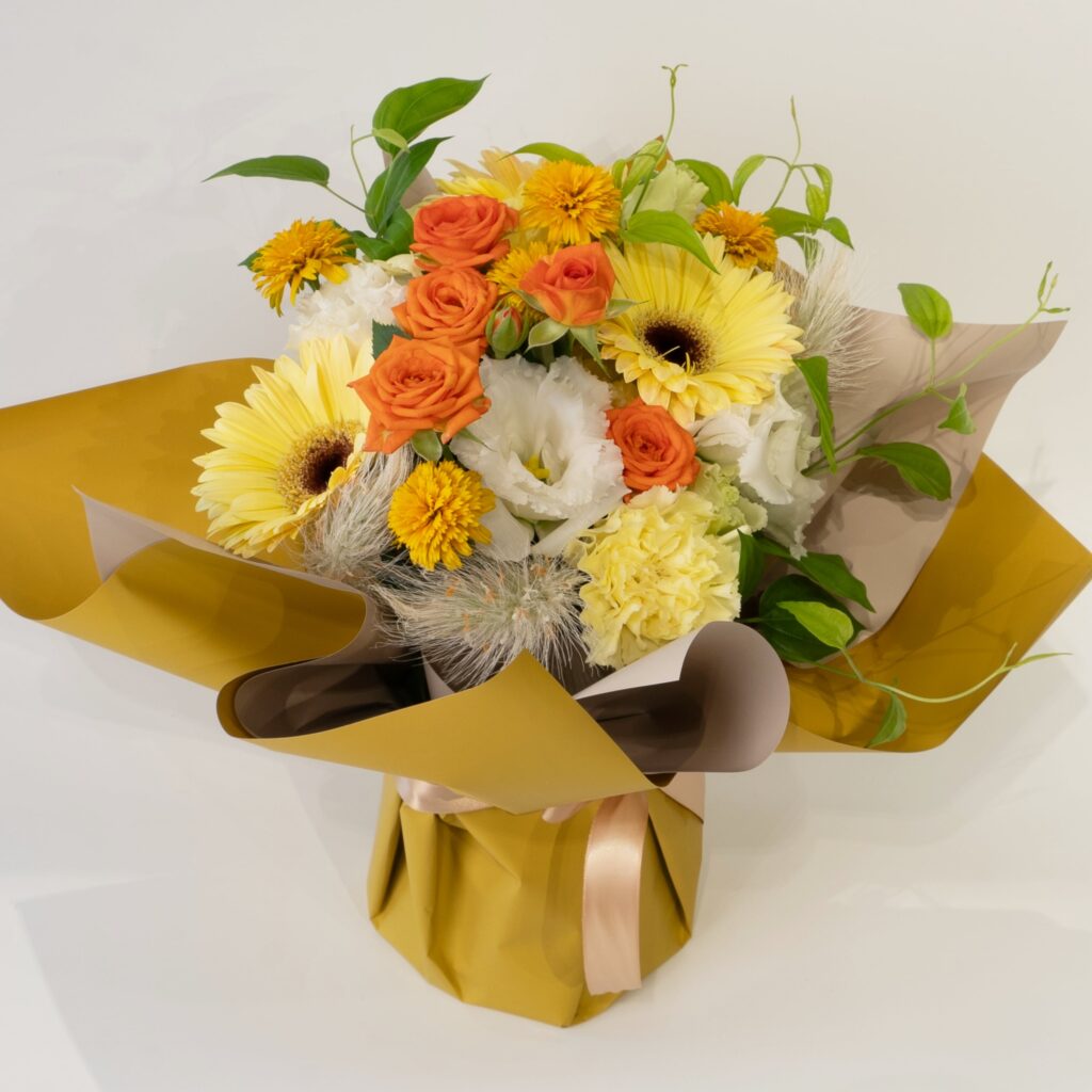 花瓶いらずでそのまま飾れる、自立型ラッピングの花束。手軽に華やかさを添えられる人気のデザインです。