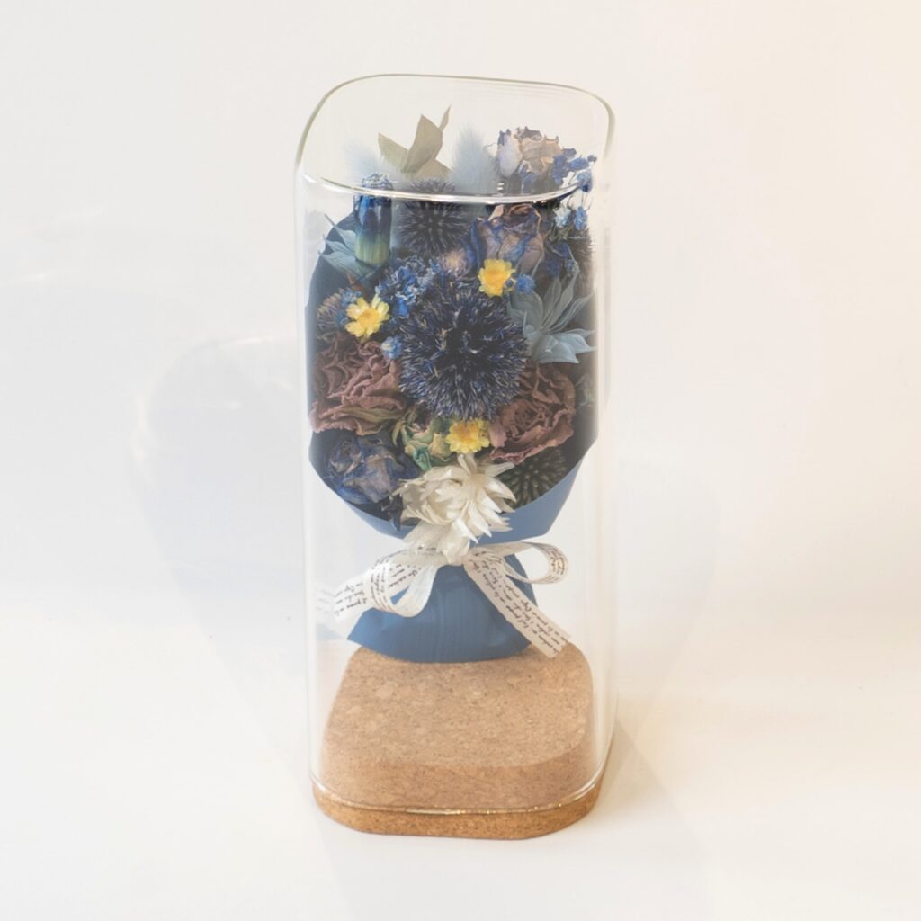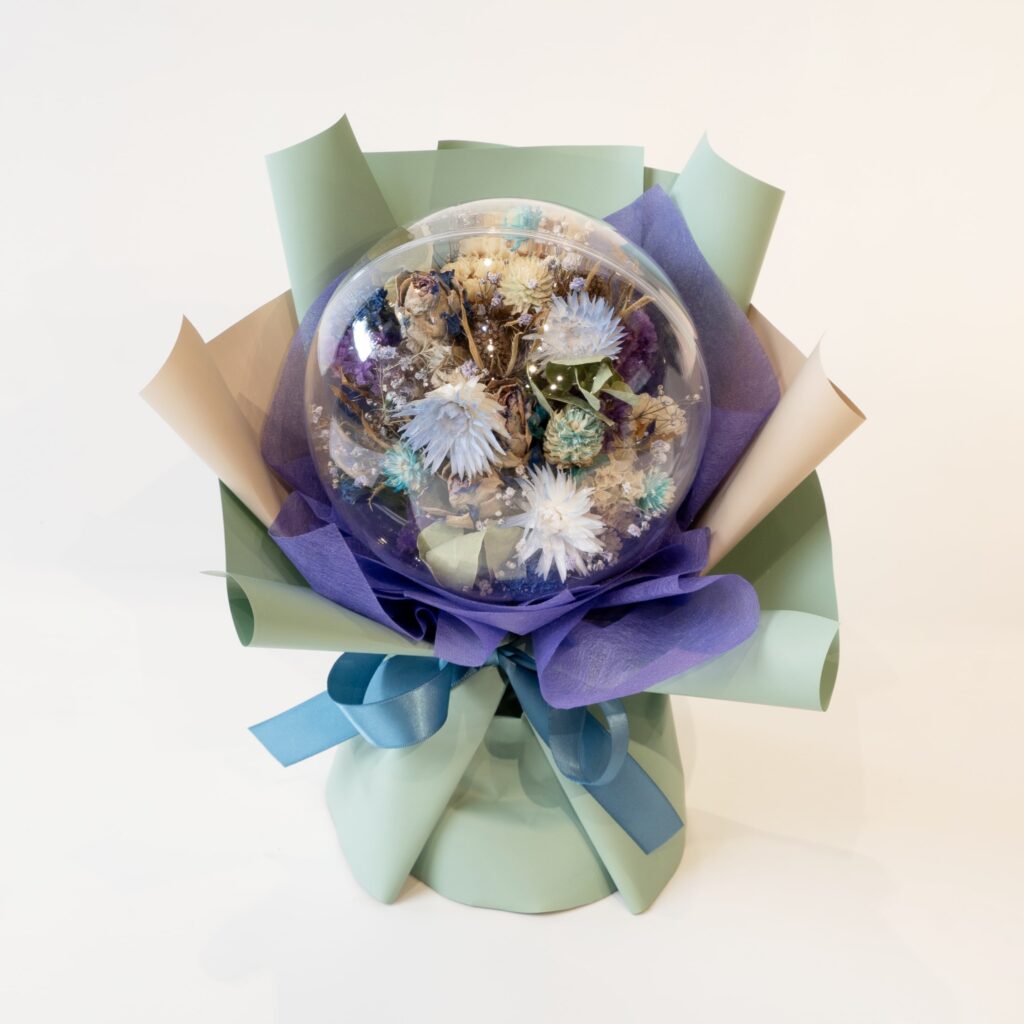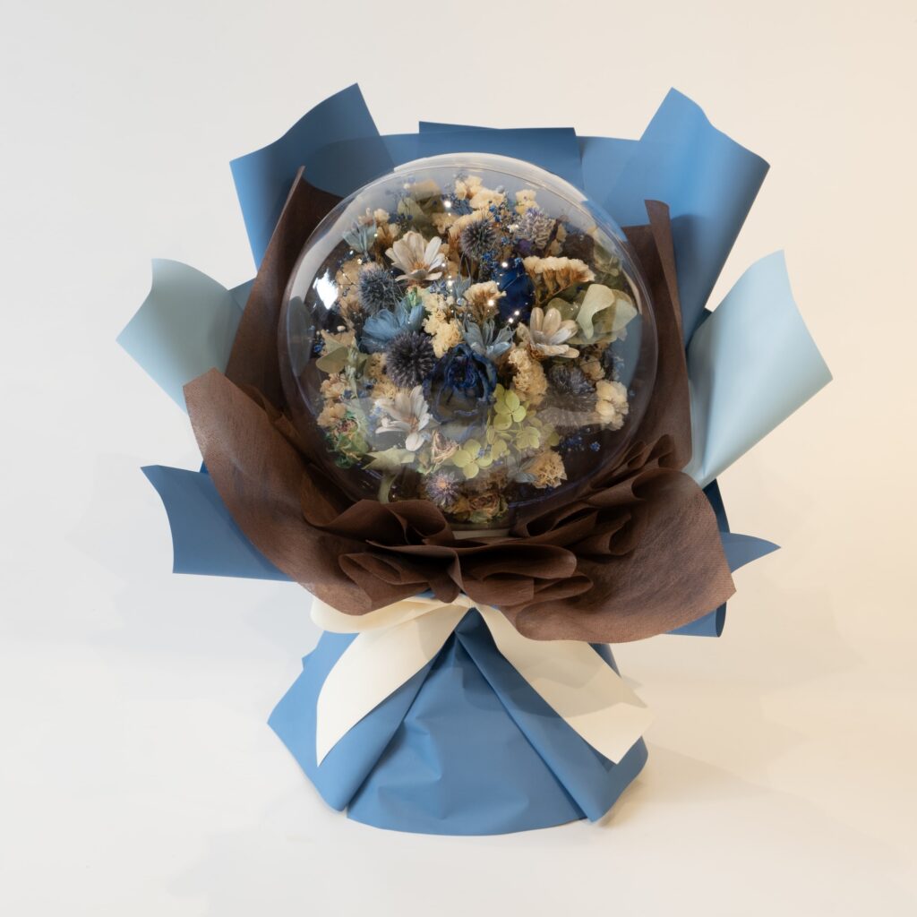 まるでバルーンのような透明ケースに、ブルーとホワイトのドライフラワーを詰め込んだ上品なブーケです。