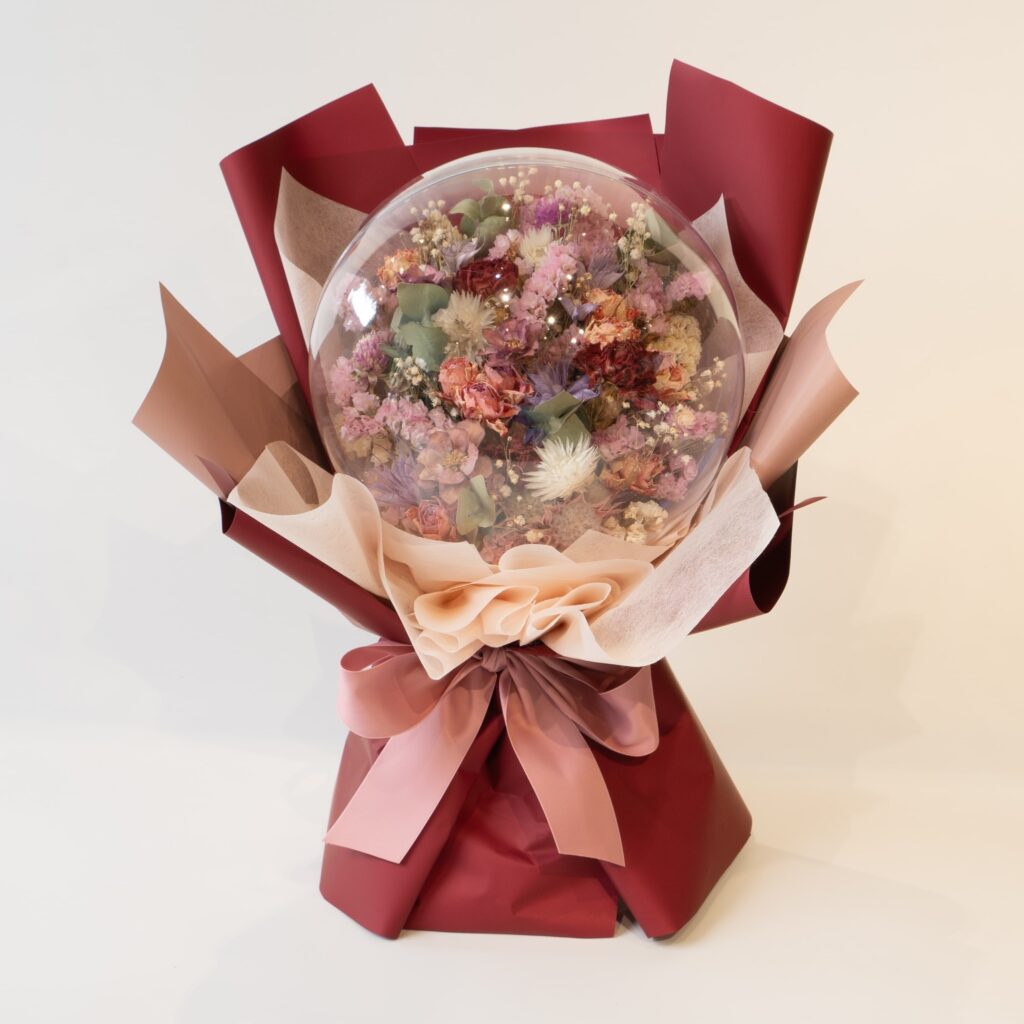 まるでバルーンのような透明ケースに、レッドとピンクの花々を詰め込んだ華やかなブーケです。