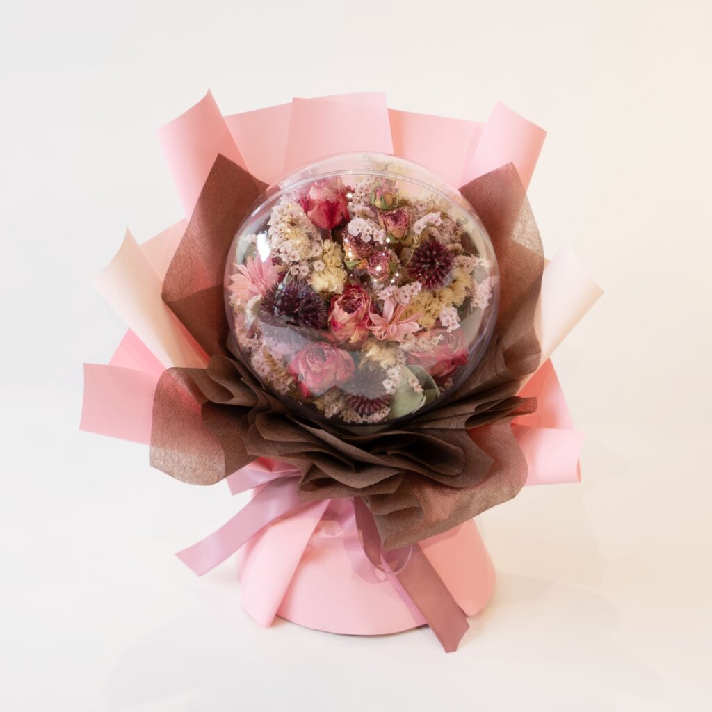 まるでバルーンのような透明ケースに、ピンクやホワイトの花々を詰め込んだ、華やかなブーケです。
