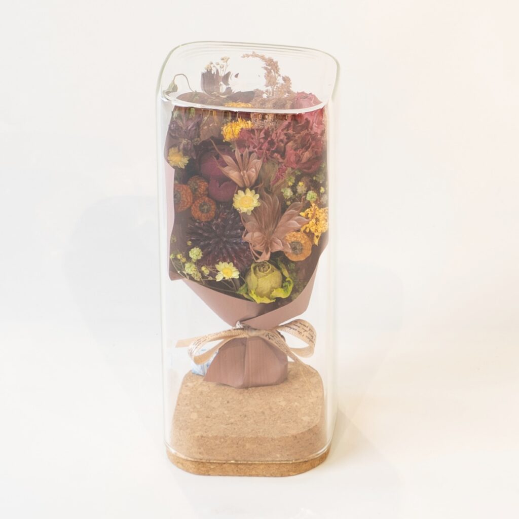 ガラスボトルに繊細なドライフラワーを閉じ込めた上品なブーケ。