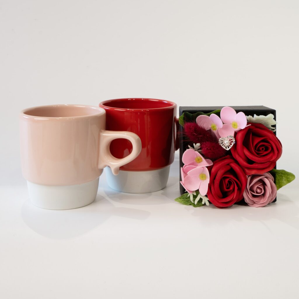 波佐見焼を手掛ける陶器ブランド「藍染窯」によるスタックスマグ2点と花西海が贈る彩り豊かなソープフラワーをセットにした、特別なギフトボックスです。