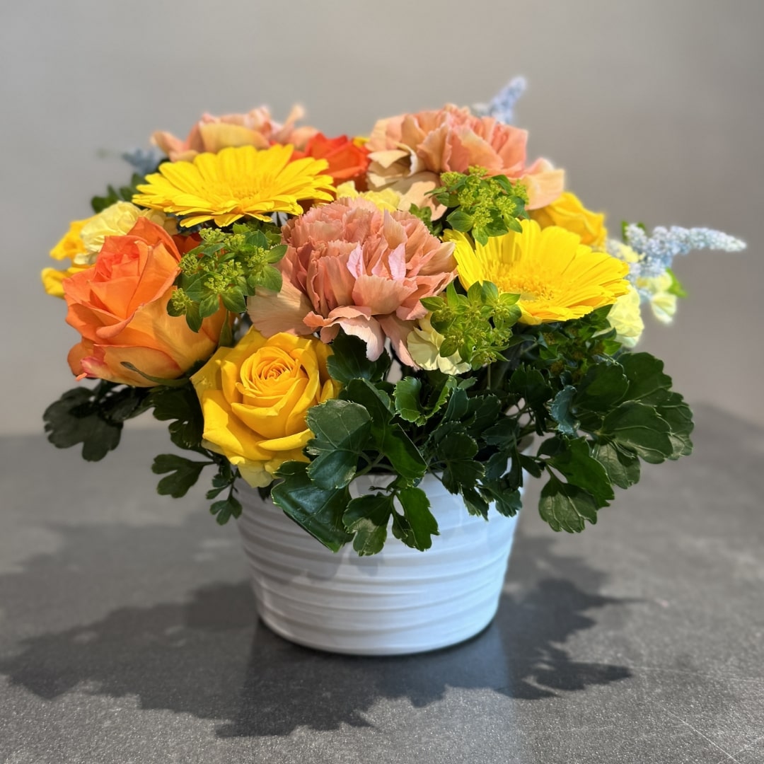 陶器鉢はおまかせ。最適なデザインの鉢をセレクトし、丁寧にアレンジしてお届けいたします。