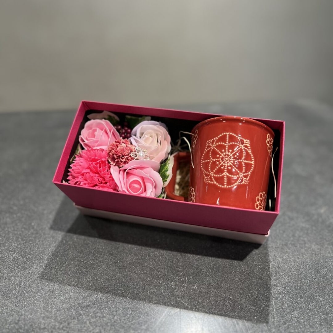 波佐見焼を手掛ける陶器ブランド「藍染窯」によるスタックスマグ2点と花西海が贈る彩り豊かなソープフラワーをセットにした、特別なギフトボックスです。