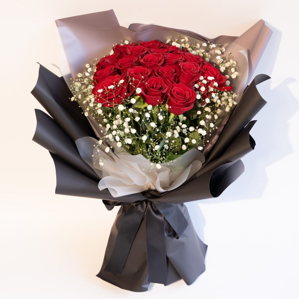 花瓶いらずでそのまま飾れる、自立型ラッピングの花束。手軽に華やかさを添えられる人気のデザインです。