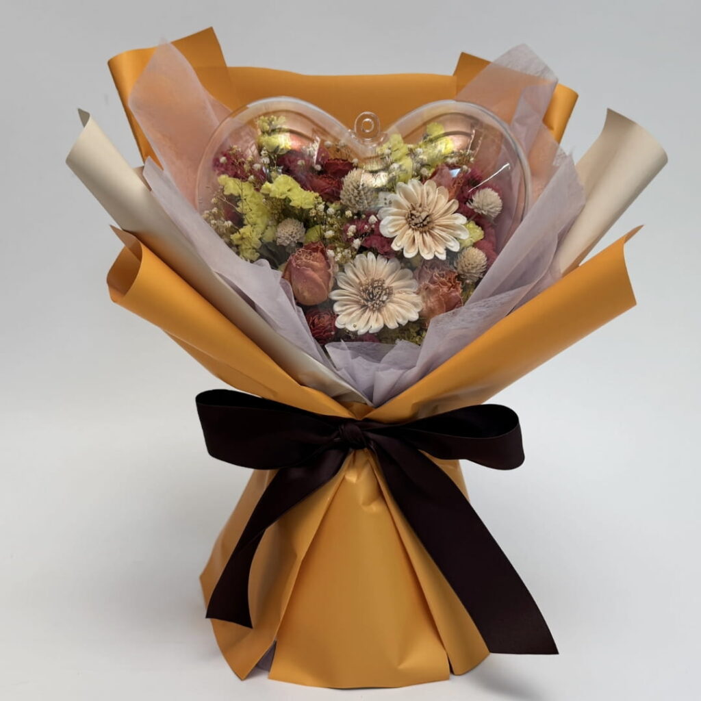 まるでバルーンのようなハートのケースに、オレンジ系のドライフラワーを詰め込んだ上品なブーケです。
