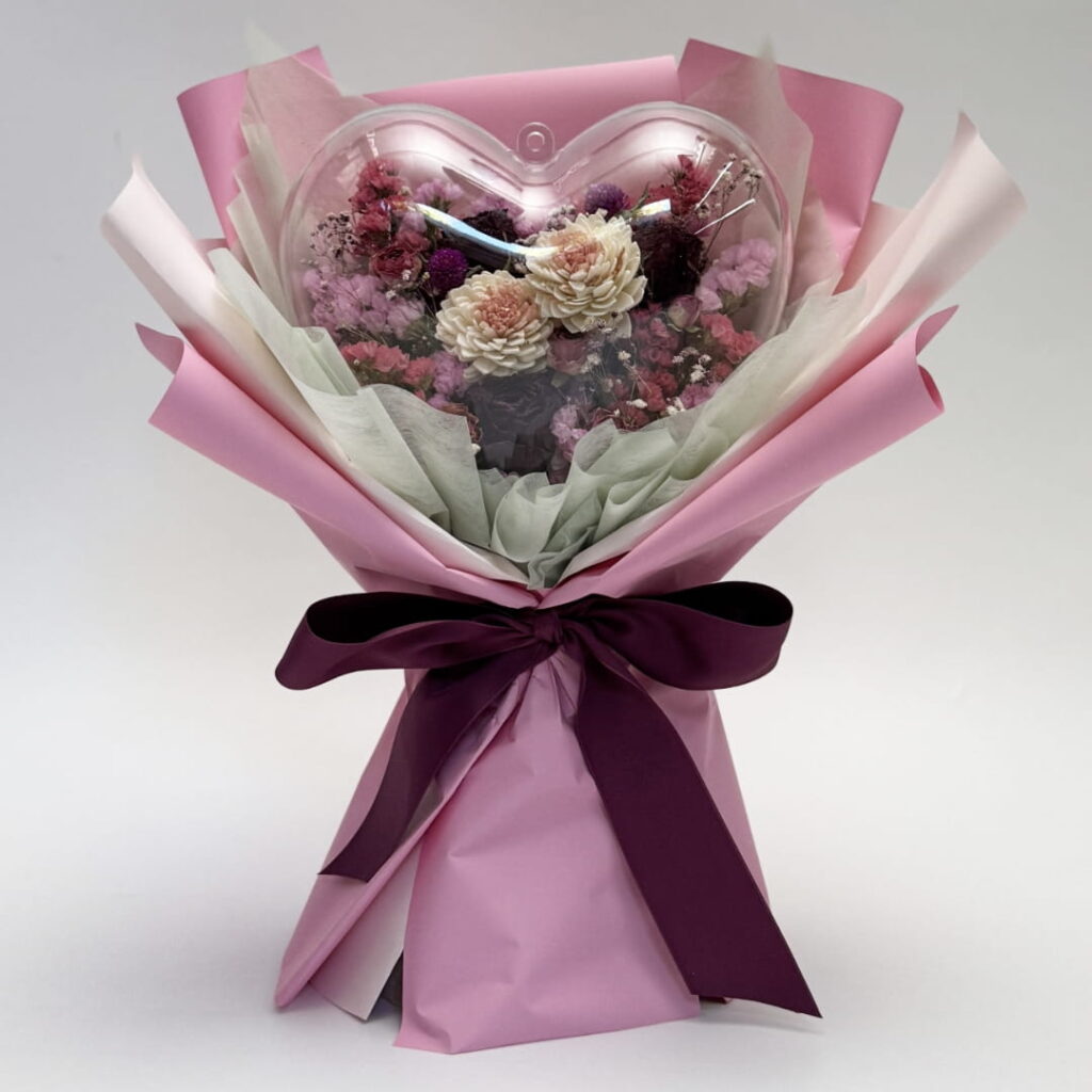 まるでバルーンのようなハートのケースに、ピンク系のドライフラワーを詰め込んだ上品なブーケです。