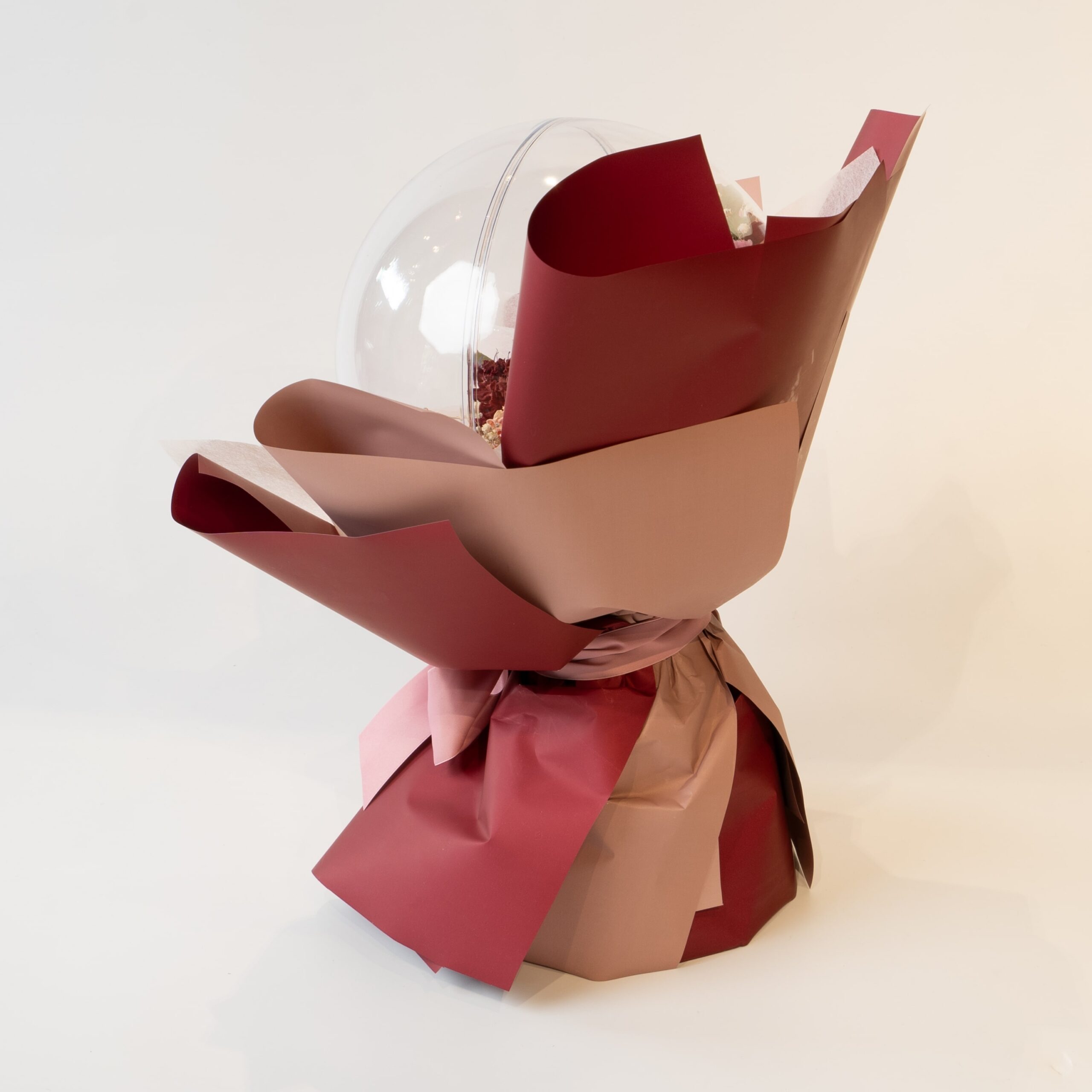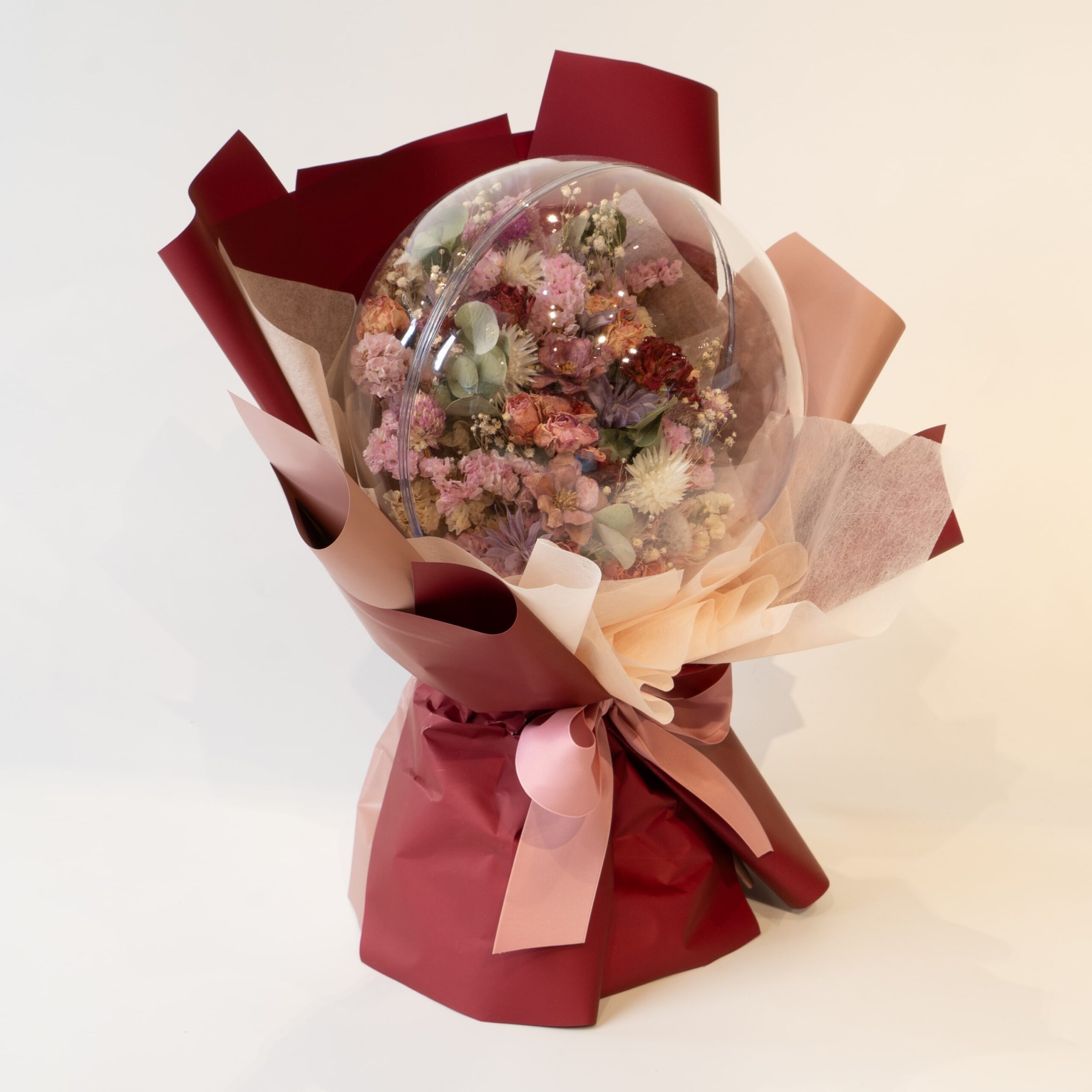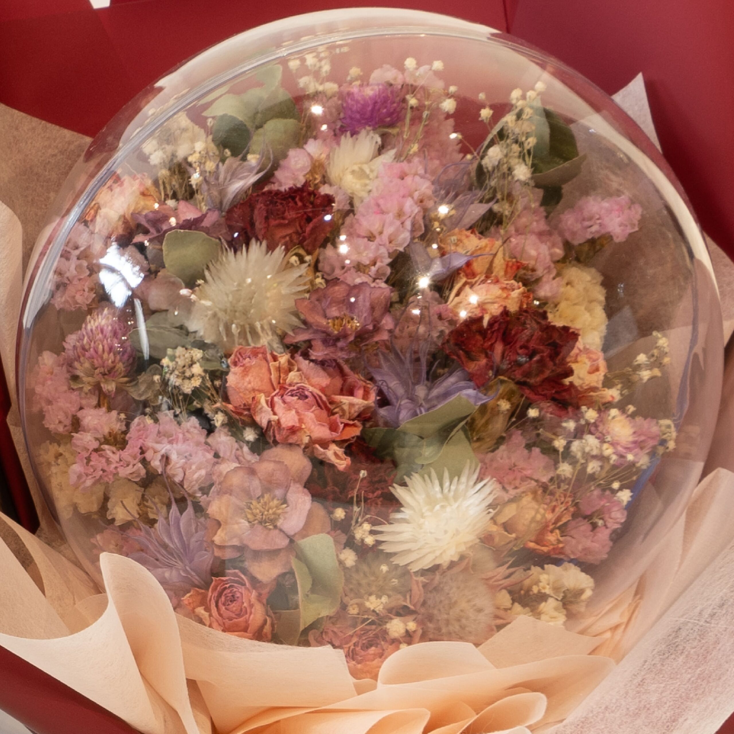 まるでバルーンのような丸い透明ケースに、レッドやピンクを中心としたドライフラワーをぎゅっと詰め込んだ、華やかで温かみのあるブーケです。