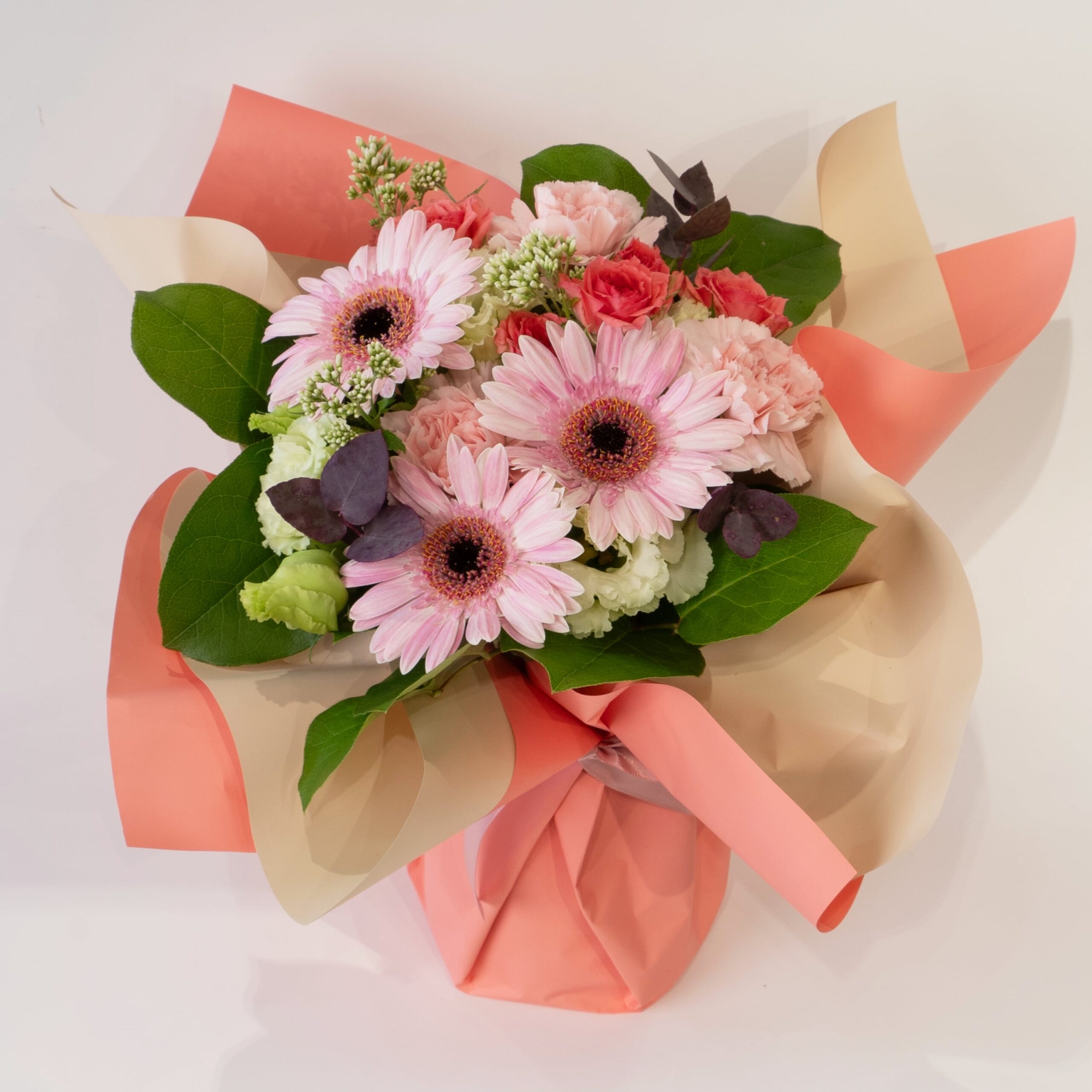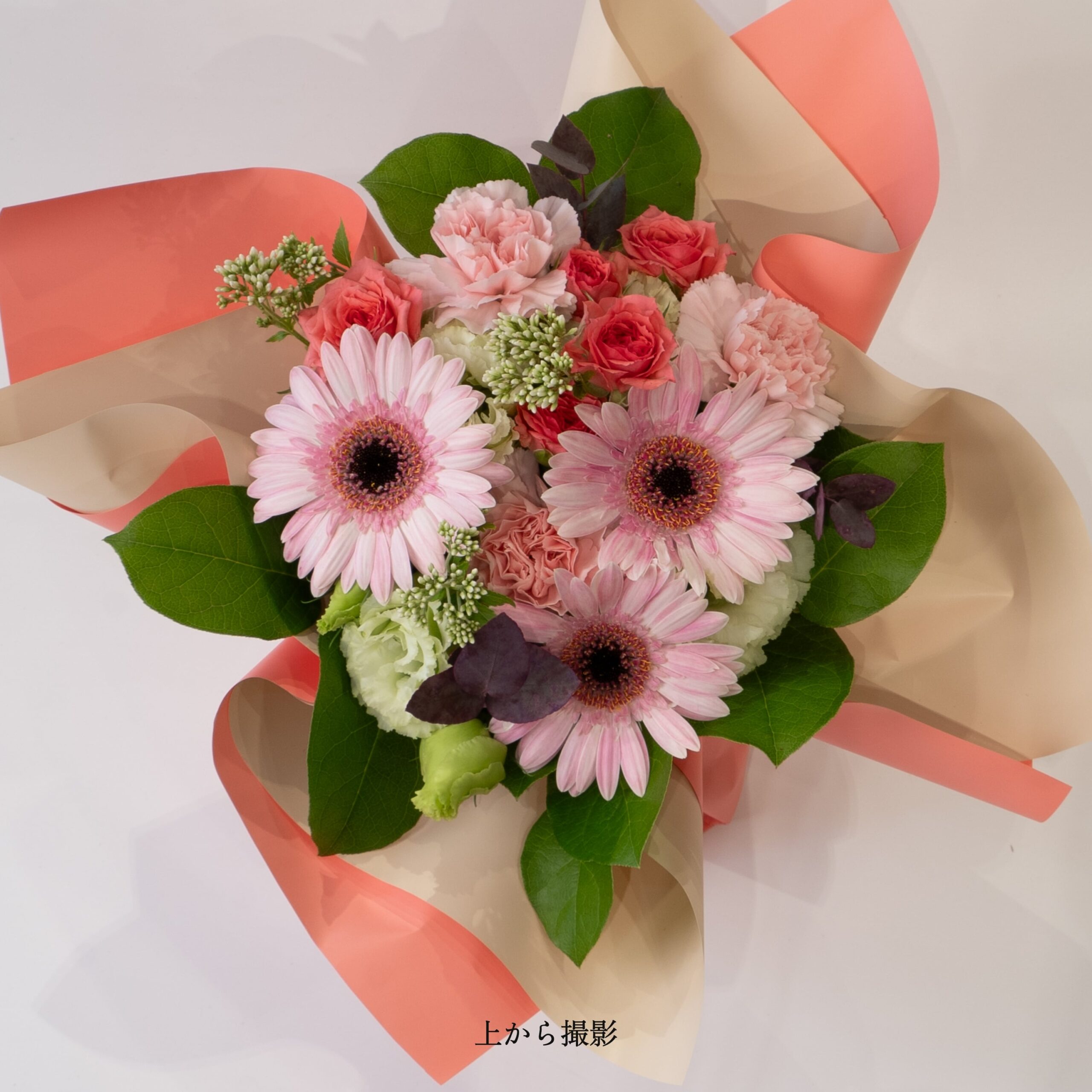 花瓶がなくてもそのまま飾れる、自立型ラッピング仕様の花束です。